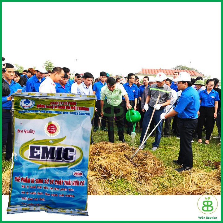 - Chế phẩm EM ( emic) xử lý rác thải làm phân bón hữu cơ: Hòa 2 gói Chế phẩm EMIC vào nước sạch, tưới đều cho 1 tấn nguyên liệu rác thải hữu cơ, tưới thêm nước để rác thải đạt độ ẩm 55 – 60%. Đánh đống ủ và dùng bạt che phủ. Cứ 7 – 10 ngày đảo trộn 1 lần. Thời gian ủ 25 – 30 ngày!
