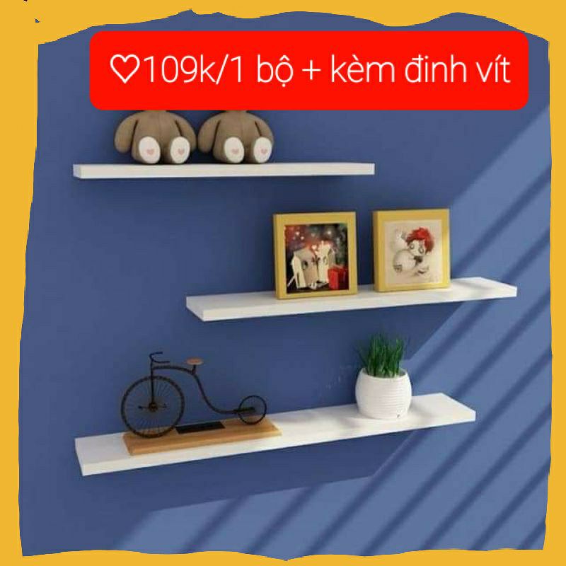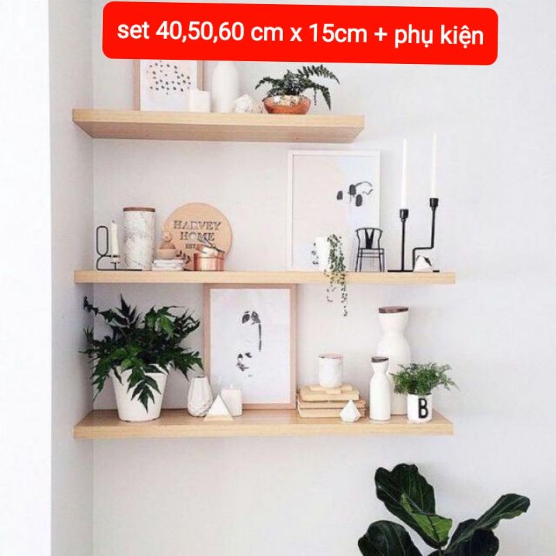 kệ có kích thước 3 thanh gồm 40cm, 50cm, 60cm, rộng 15cm, dày 2cmmàu vàng vân gỗ. đen ,trắngbao gồm đinh vít và tắc kê kê gắn lên tường.