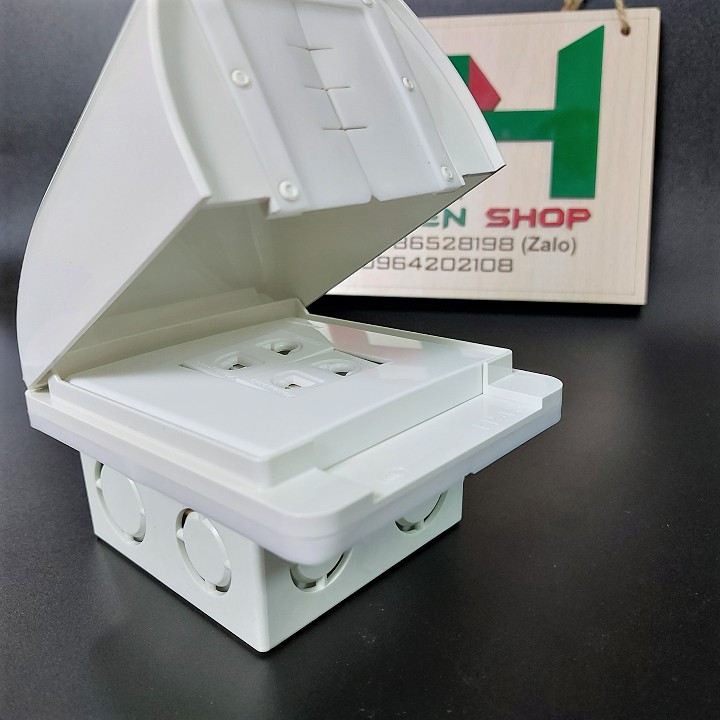 Mặt ổ cắm chống nước loại vuông có màu trắng tinh tế, đẹp mắt, dễ lắp đặt, chức năng ổn định. Hộp ổ cắm dày, có khe hở luồn dây điện tiện lợi.