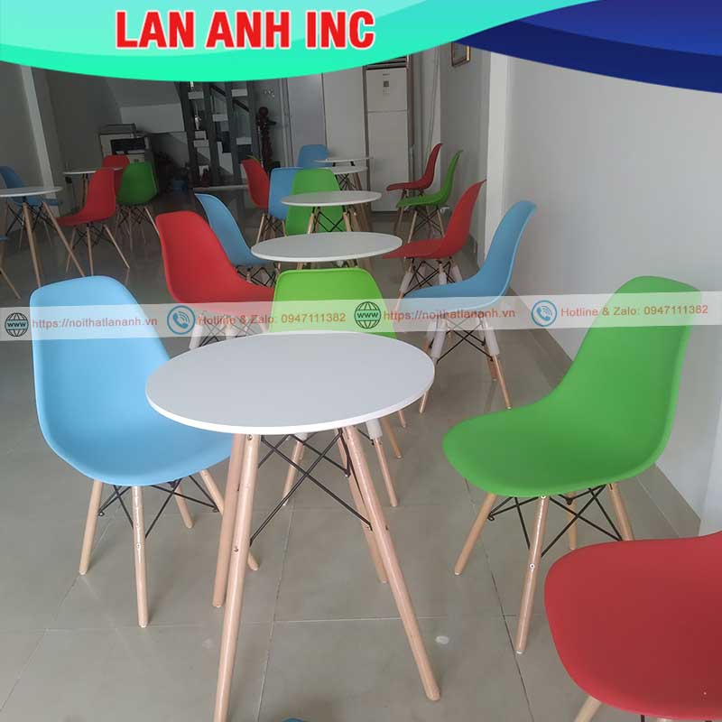 - Bộ bàn tròn Eiffel 4 ghế với thiết kế trứ danh của nhà Charles & Ray Eames, phù hợp với nhiều phong cách nội thất, đặc biệt là những nơi có diện tích nhỏ, cần tiết kiệm không gian. Kiểu dáng sang trọng, đẹp mắt, mẫu bàn này thích hợp để tiếp khách, làm bàn trà, bàn ăn... trong văn phòng, gia đình hoặc quán cafe.