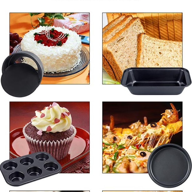 Với bộ khuôn làm bánh chống dính có các kích thước và kiểu dáng khác nhau sẽ giúp bạn có thể thỏa sức làm các loại bánh khác nhau như: Pizza, bánh mỳ hoa cúc, bông lan, cupcake, mousse, tiramisu,....