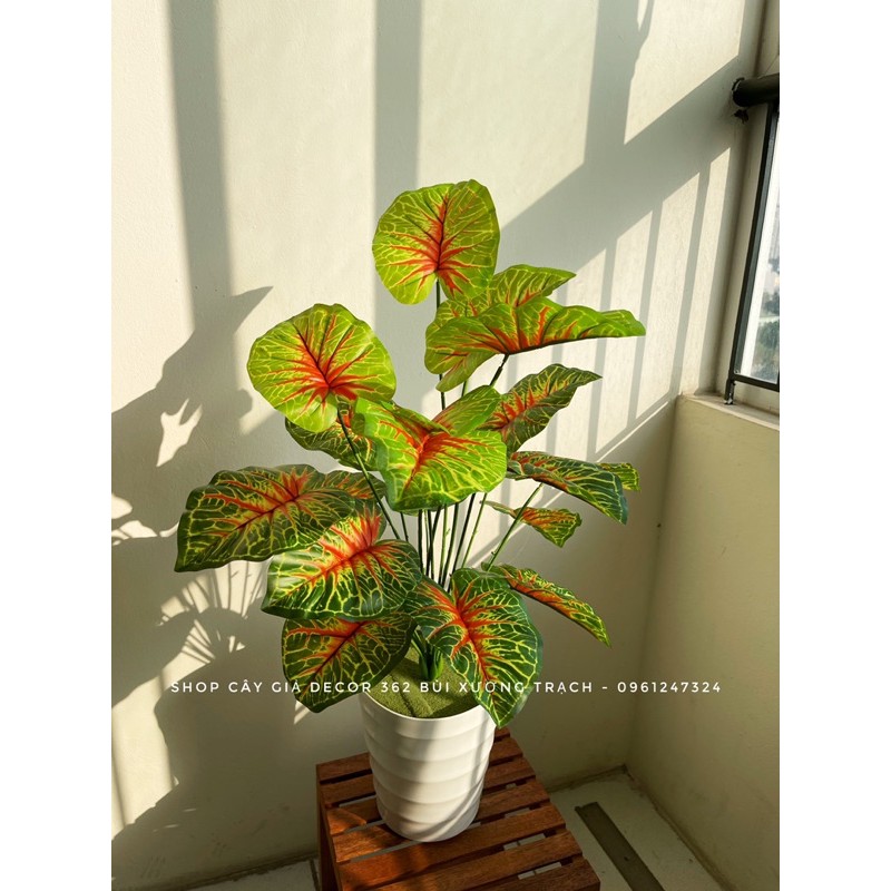 sản phẩm là các mẫu cây giả như hình, lá kích thước 17x21 cm cực to ạ.- mỗi cây gồm 18 lá to (Kích thước lá 17x20cm), chiều cao tầm 75cm, shop có bán kèm chậu tròn như trên.