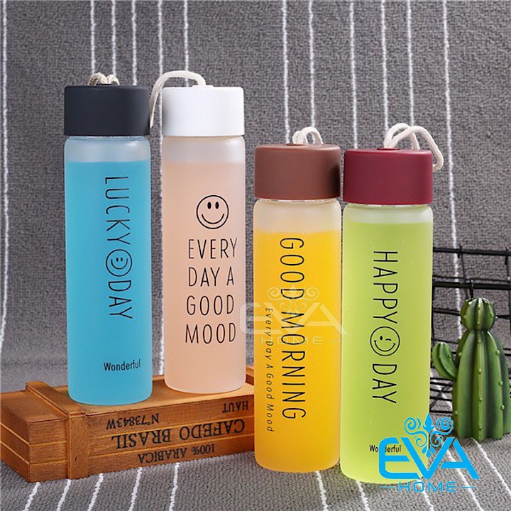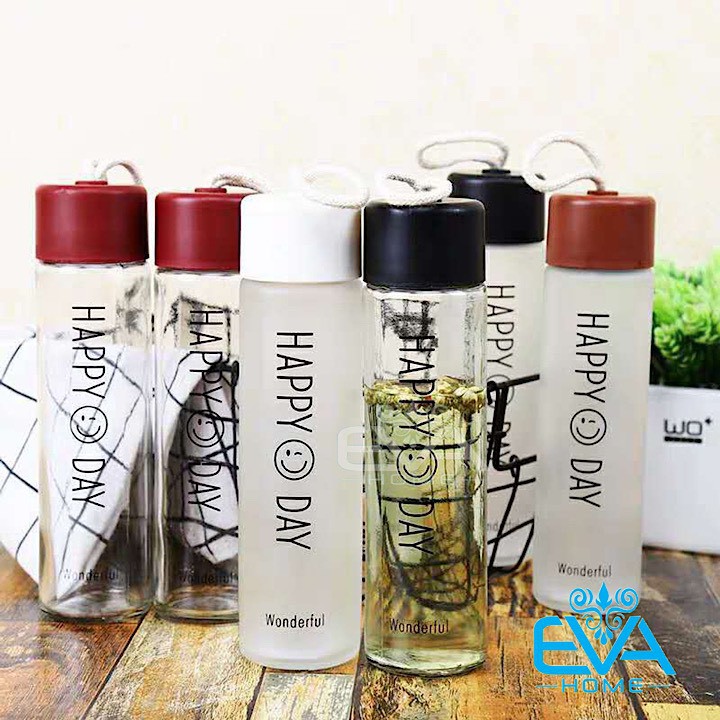 ***Mô tả sản phẩm : Chai thủy tinh mờ dây xách Happy day
