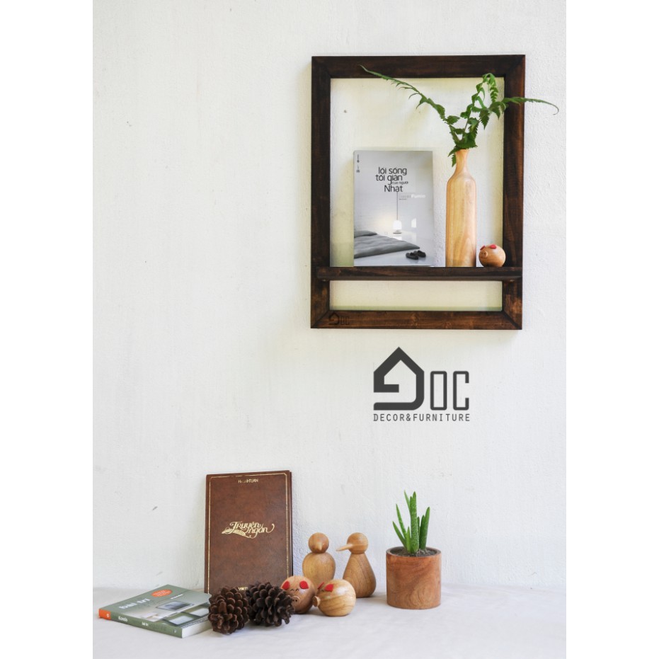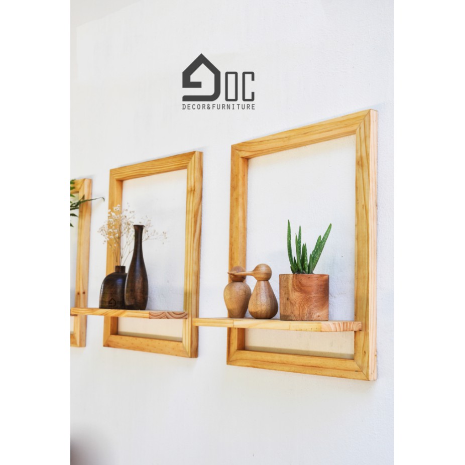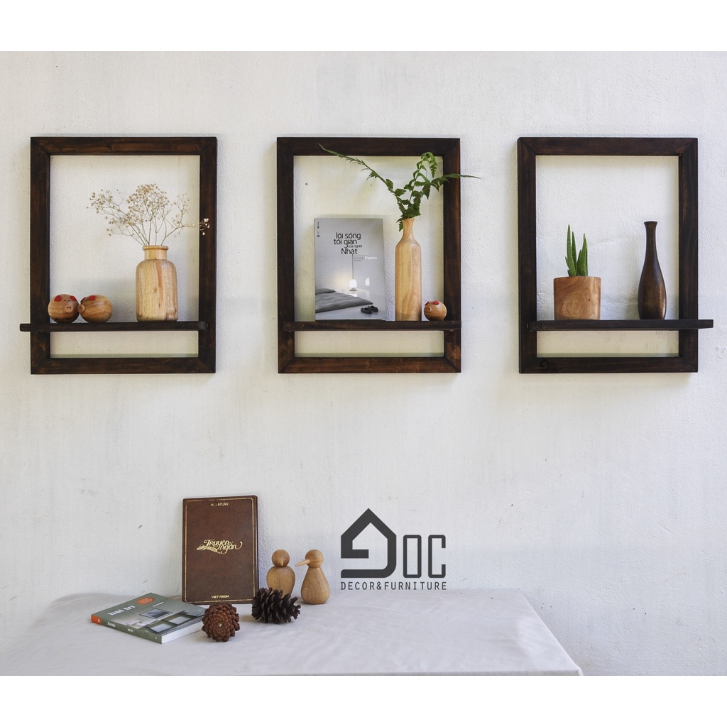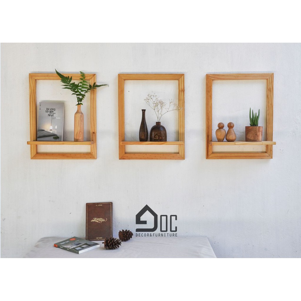 Khung kệ gỗ trang trí treo tường là bức tranh bạn có thể tự do sáng tạo nội dung. Chỉ bằng cách đặt lên đó bất cứ món đồ trang trí nào như một lọ hoa nhỏ xinh, một cuốn sách yêu thích…. Và khi thay đổi những món đồ trang trí này mỗi ngày bạn sẽ lại có một bức tranh tươi mới khác.