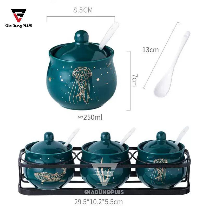 Bộ ba hủ đựng gia vị cao cấp bằng gốm sứ, màu xanh ngọc lục bảo sang trọng gồm 3 hủ đựng gia vị, 3 muỗng gia vị sứ, khay đựng bằng sứ hoặc giá treo tường màu đen sơn tĩnh điện.