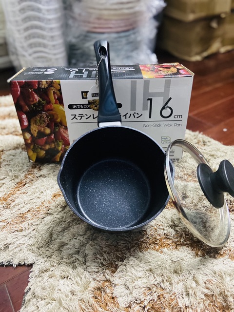 Kích thước: nồi 16 cm cao 9 cm cán dài 19 cm