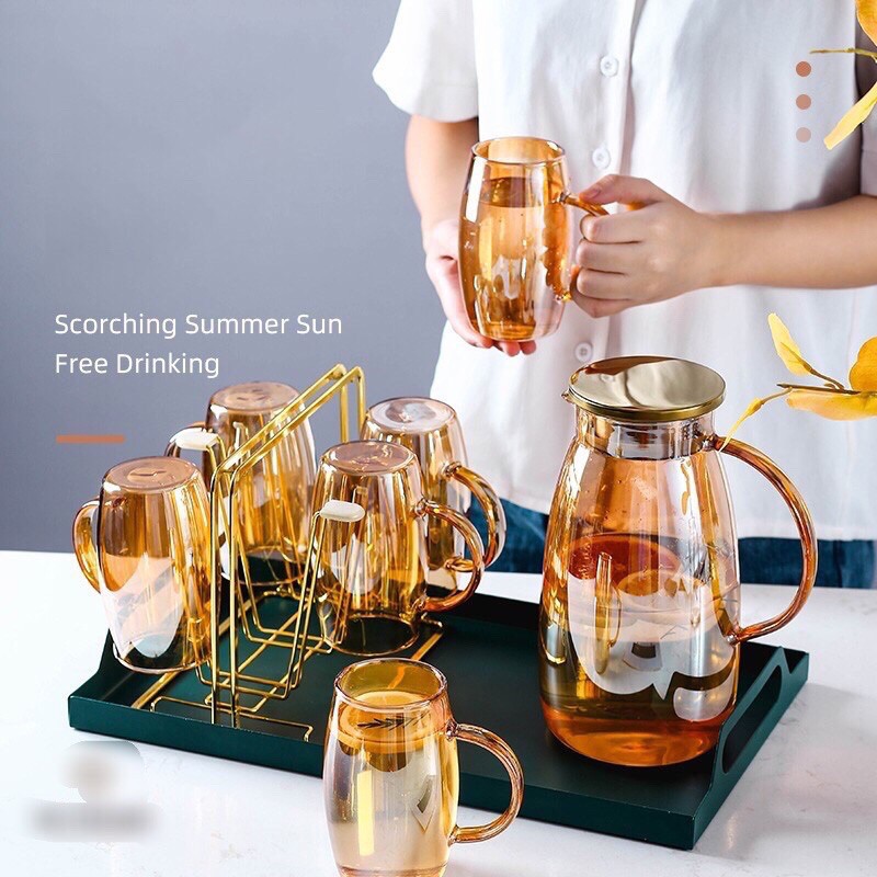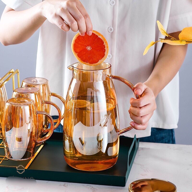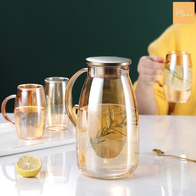 Bình nước thủy tinh chịu nhiệt ánh vàng 2L (dáng bầu)