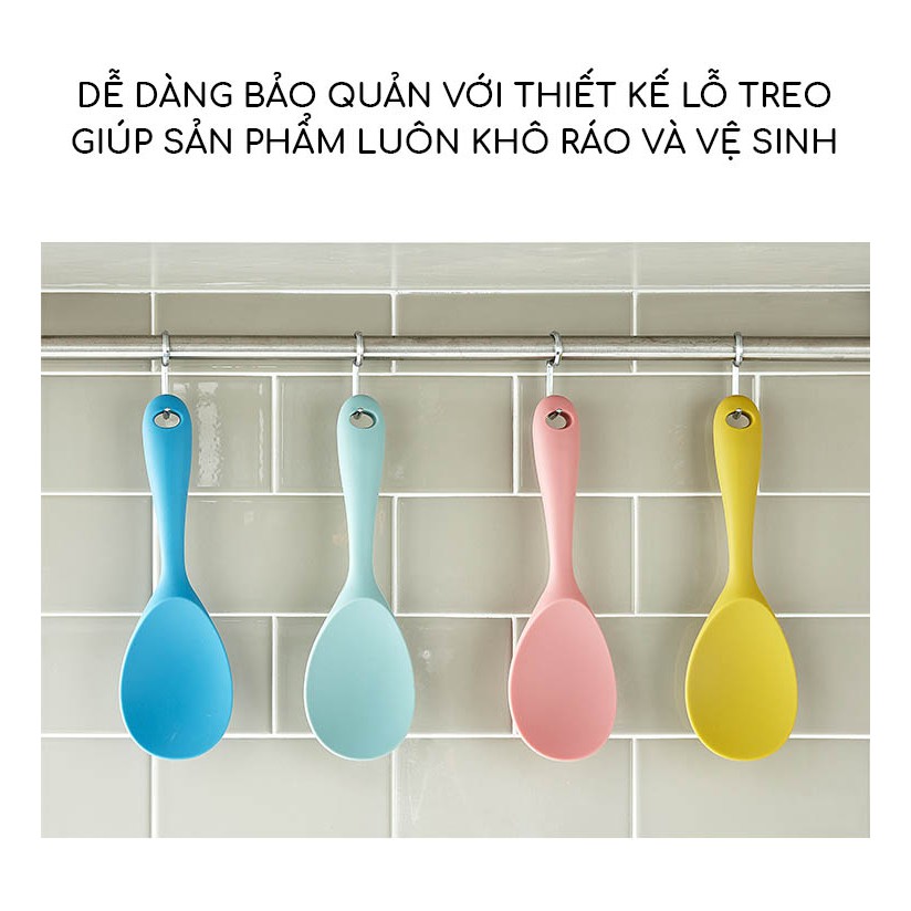 - Thiết kế nhỏ gọn , nhiều màu và tiện dụng . Sở hữu thiết kế nhỏ gọn với tay cầm vừa vặn và có khả năng chống trơn hiệu quả, phần lòng muôi có độ khum vừa phải giúp việc lấy cơm dễ dàng. Với khả năng chống dính tốt, sản phẩm giúp lấy cơm dễ dàng và chính xác, đặc biệt dễ vệ sinh sau khi sử dụng.