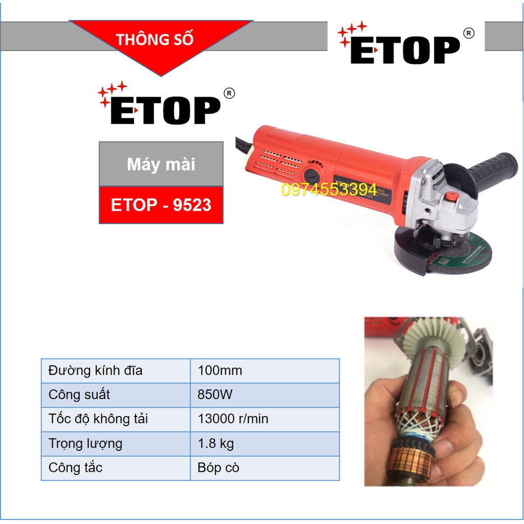 Nhà cửa & Đời sống > Dụng cụ & Thiết bị tiện ích > Dụng cụ > Cưa, máy cắt & máy mài || Máy mài | ETOP 9523 - CÔNG NGHỆ CHỐNG NÓNG | Công suất 850WCòn hàng