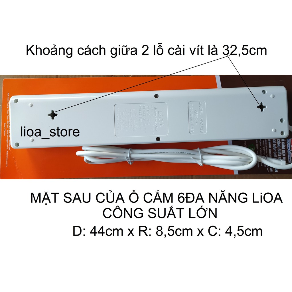 -Thân ổ cắm màu trắng có gắn thương hiệu LiOA . Mỗi ổ cắm mang 1 màu sắc khác nhau giúp cho người sử dụng phân biệt được dễ ràng khi dùng nhiều thiết bị cùng 1 lúc. trên mỗi mặt nắp nhựa ổ cắm đều có chữ LiOA. ( để tránh hàng giả hàng nhái)., các ổ cắm dều có nắp che AN TOÀN . ( tránh trường hợp nhà có trẻ con vô ý thò tay vào ổ cắm khi đang có điện . khoảng cách giữa các ổ là đảm bảo cắm được các phích có bản to.