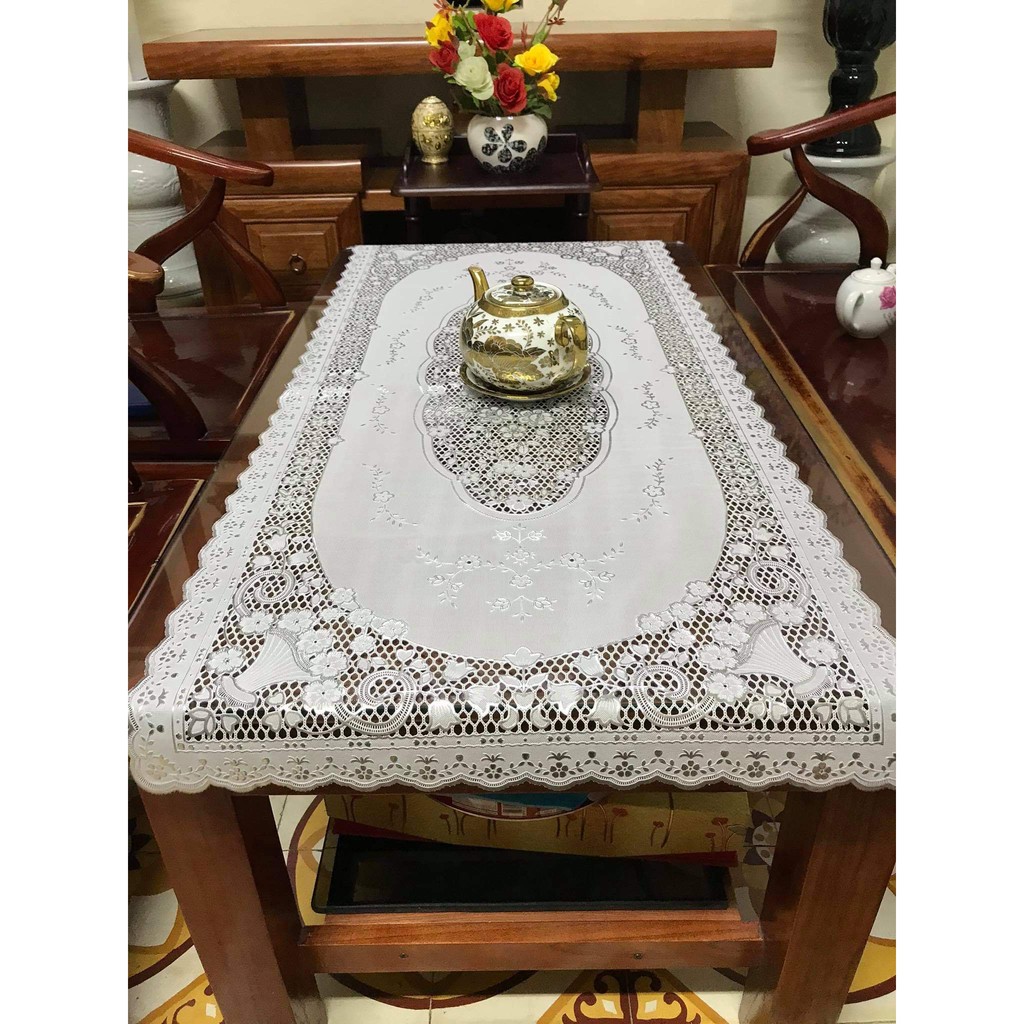 📣📣 Khăn trải bàn Ren Hoa Nhựa PVC hình bầu dục + chữ nhật 50x110cm 📣📣👉Chất liệu: Khăn được sản xuất trên dây chuyền hiện đại theo công nghệ Nhật Bản, chất liệu PVC, hoa văn trang trí được in nổi 3 chiều, dày dặn.