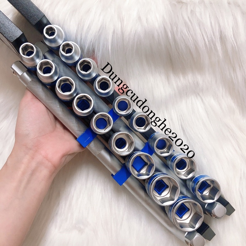 Bộ 10-24mm bao gồm: 1 cây cần L 1/2 tương đương 12.7mm đầu vuông và 9 cục tuýp nhỏ 1/2 10, 11, 12, 13, 14, 17, 19, 22, 24mm