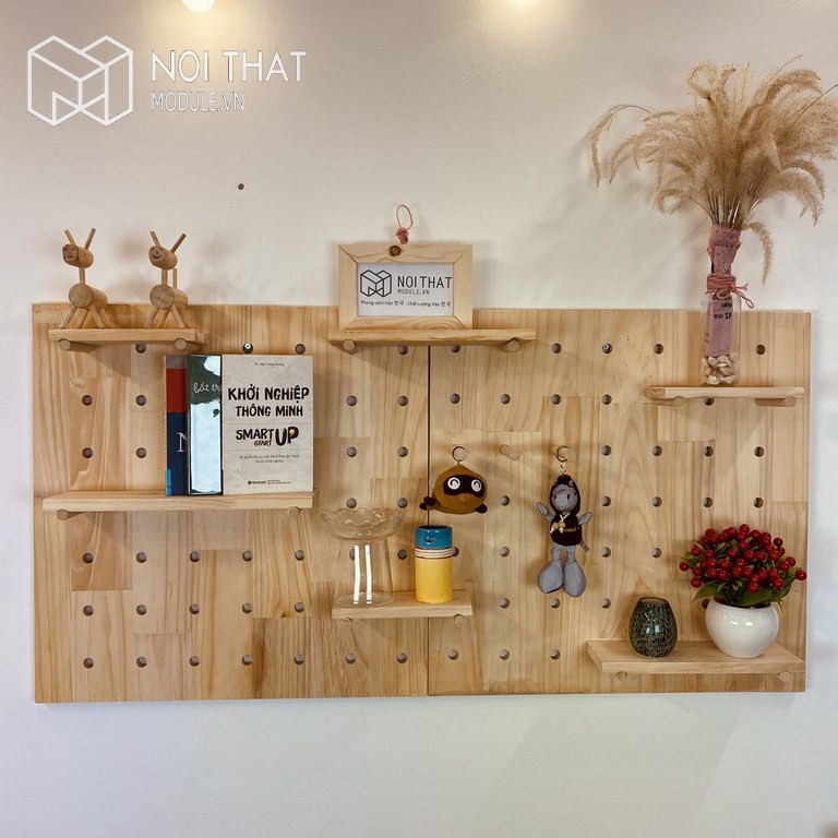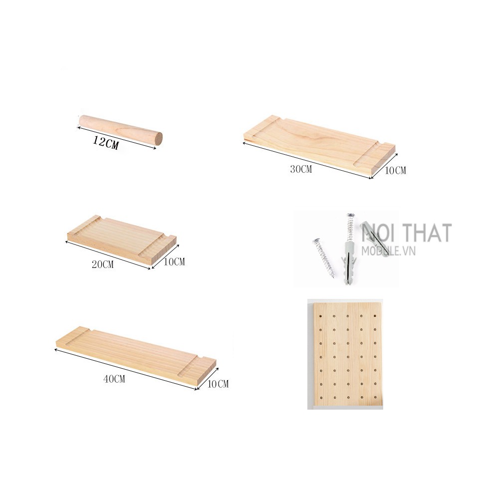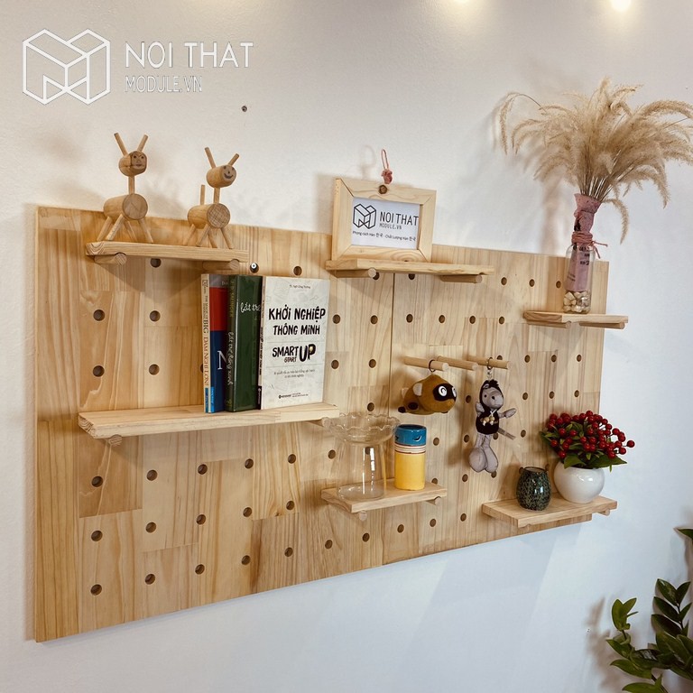 - Bộ sản phẩm bao gồm: 1 Kệ gỗ Pegboard, 5 đợt, 18 trụ đỡ, ốc vít kèm theo