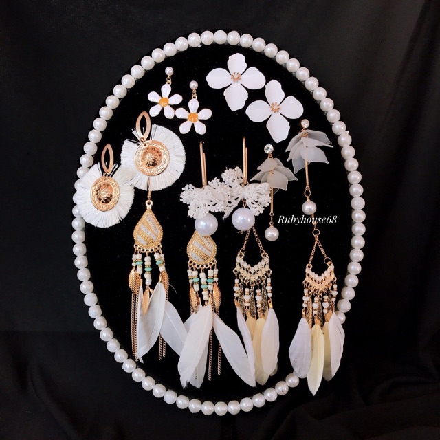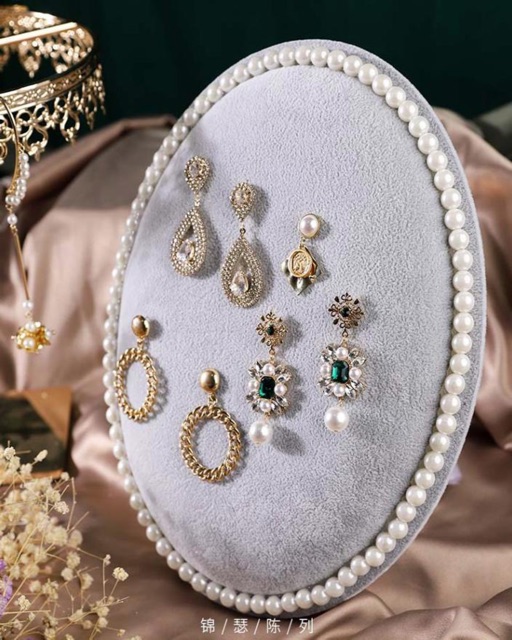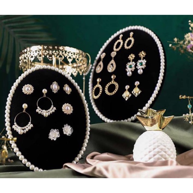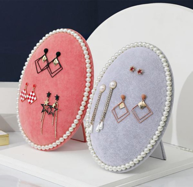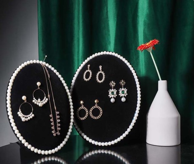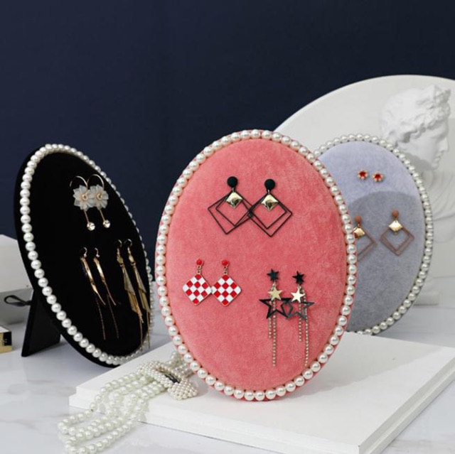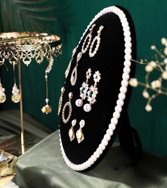 Kệ nhung hình oval viền hạt bên ngoài , sang trọng , đẹp mắt & thiết kế độc / lạ cho các bạn muốn treo/trưng bày hoa tai , dây chuyền , lắc .....👉👉 Kệ có chân dựng đứng như khung tranh & 1 móc treo cho bạn treo tường .