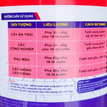 - Cây ăn trái, cây công nghiệp: 30 - 40g cho 16 lít nước, tưới xung quanh bộ rễ theo tán cây.
