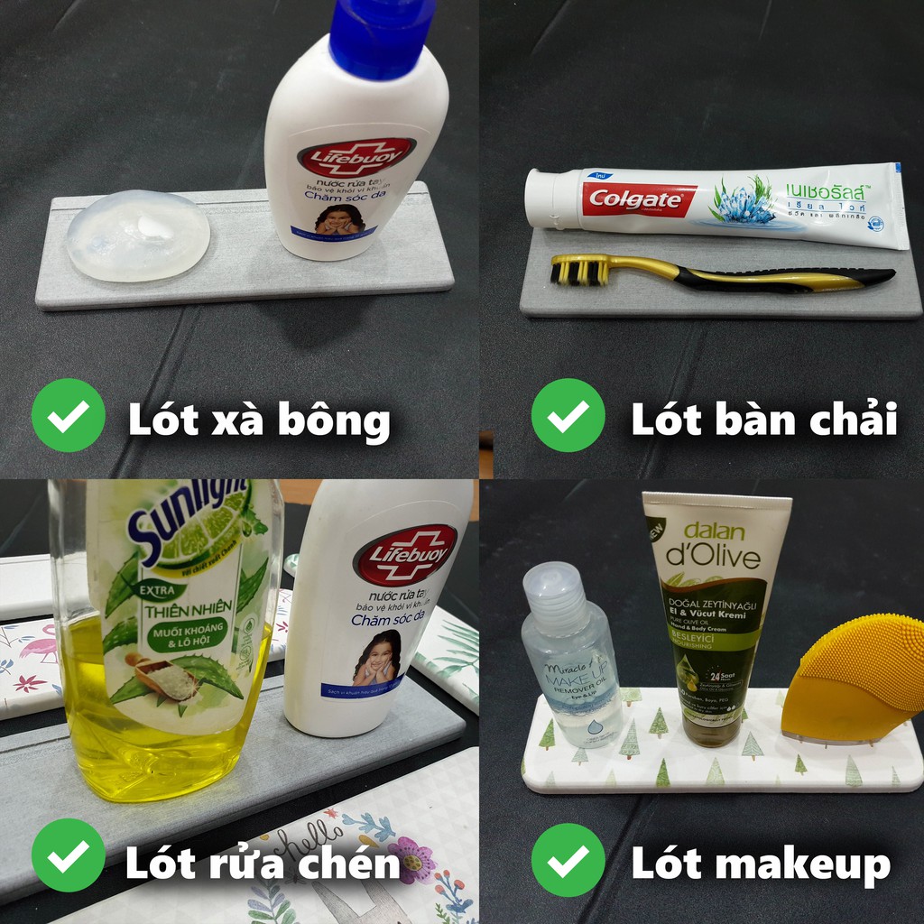 🤙 Công dụng: Thảm đá diatomite Để lót bàn chải, ly nước, đồ make up, chai rửa tay, chai rửa chén,... trên kệ bếp hoặc bồn rửa mặt. Bạn sẽ không phải chịu cảnh nước chảy tràn lan nữa.