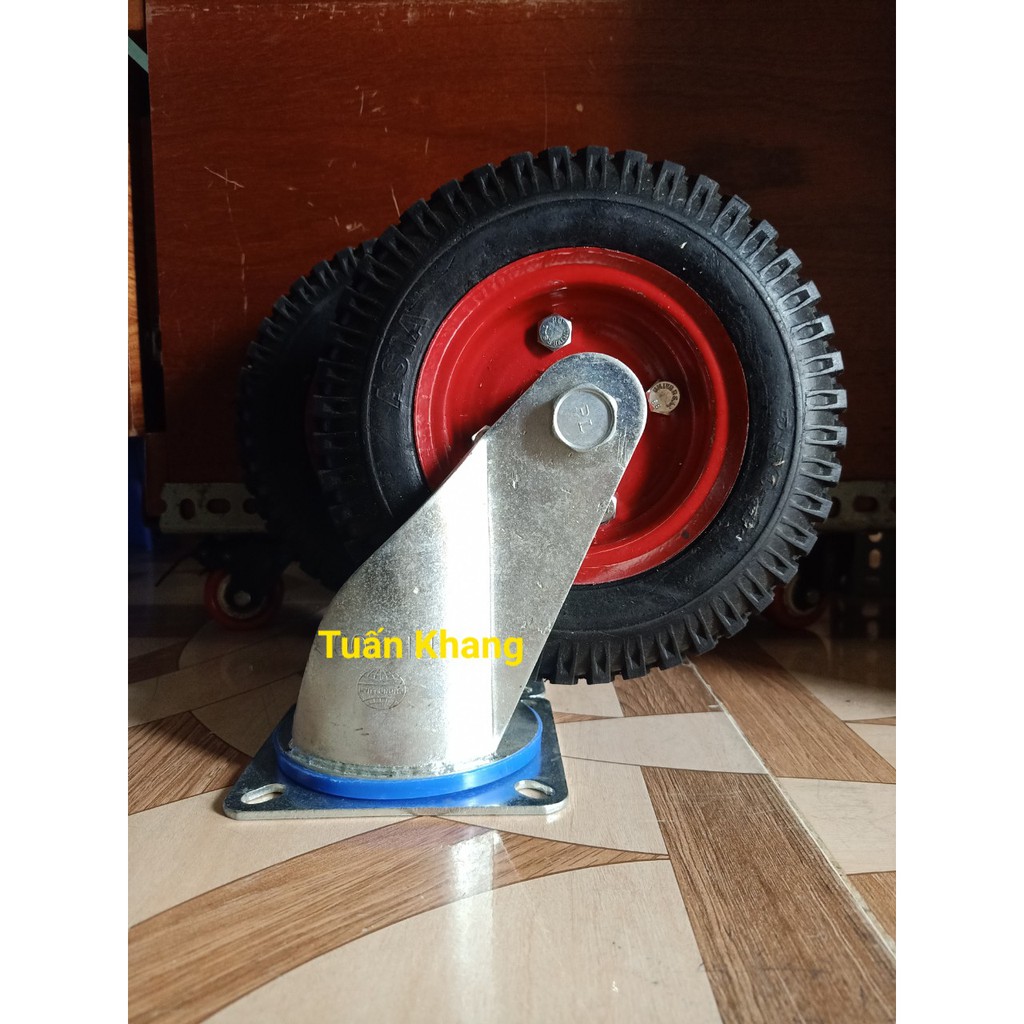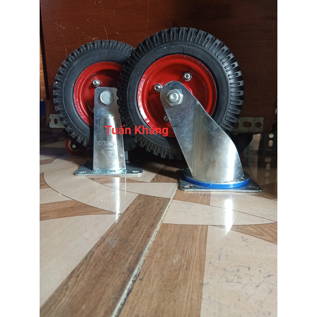 Bánh xe cao su lắp xe đẩy hàng loại 20cm có trục đứng cố định và trục xoay 360 độBánh xe 20cm dùng để thay thế hoặc lắp mới bộ xe kéo, xe đẩy hàng.