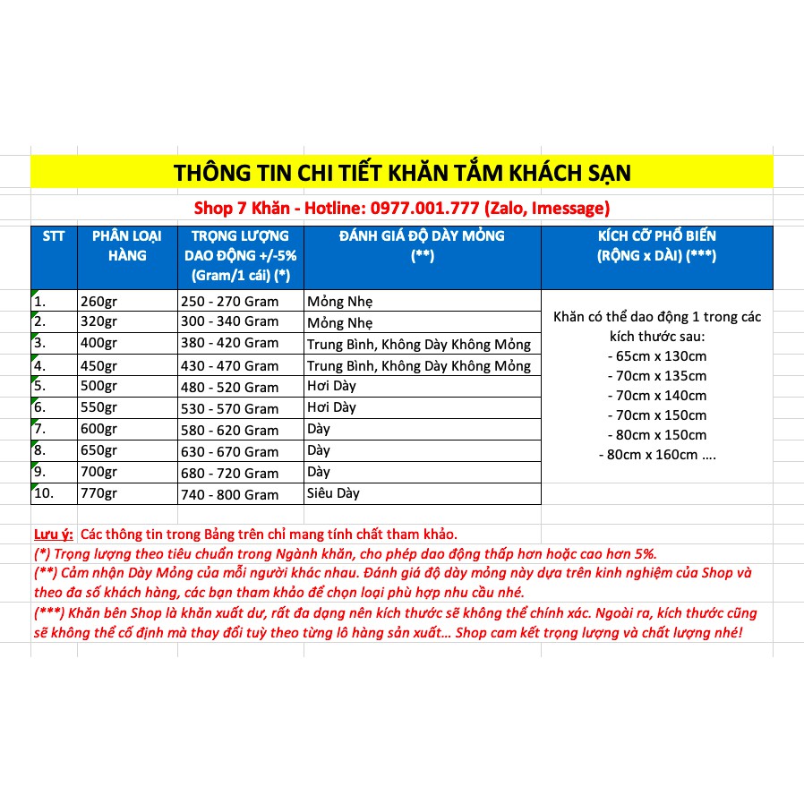 - Kích thước và Trọng lượng: Các bạn tham khảo trong Ảnh Thông tin chi tiết Khăn tắm Khách sạn để chọn loại phù hợp với nhu cầu sử dụng nhé. >>> Thoải mái inbox Shop nếu các bạn còn vấn đề gì thắc mắc nha.