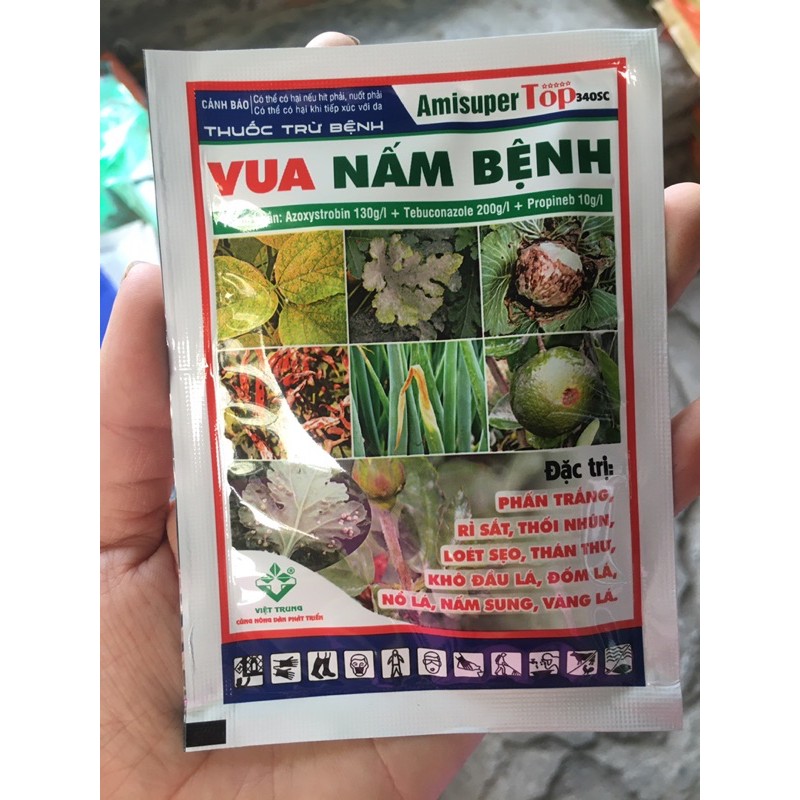 Thuốc trừ bệnh Vua Nấm Bệnh là thuốc trừ bệnh phổ rộng, được đăng ký phòng và trị được nhiều loại bệnh hại như : nấm xung, gỉ sắt, phấn trắng, thán thư, đốm lá, sương mai, giả sương mai, đốm nâu, bệnh đổ ngã cây con, mốc sương, lở rổ rễ, đốm mắt cua, thối búp .... Trên nhiều đối tượng cây trồng khác nhau như hoa hồng, dưa hấu, dưa chuột, hành, ớt, các loại hoa cây cảnh, cà chua ....HDSD : pha 1gói thuốc với 18-25lit nước, phun ướt đều tán lá cây trồng. Chi tiết xem mặt sau bao bì.