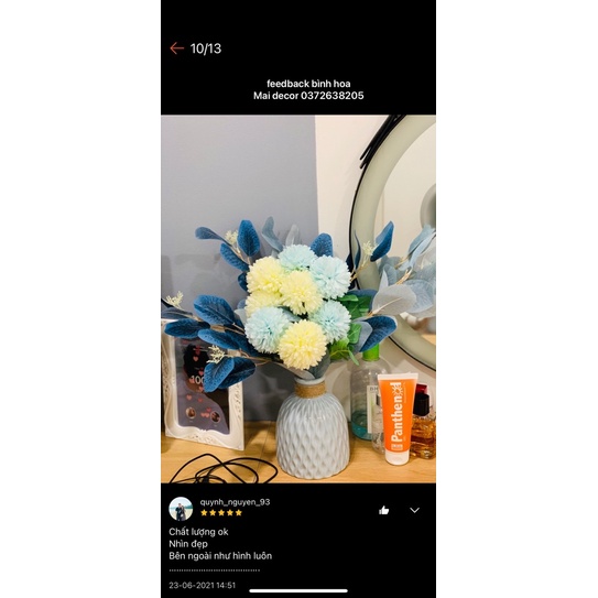 Bình hoa bồ công anh về hàng rồi ạ. Màu xanh navy siêu đẹp và sang chảnh, tiếc gì chỉ với hơn 200k mà sở hữu 1 bình hoa trang trí vĩnh viễn nhỉ. Shop về cả 2 loại bó 5 bông hoa và bó 8 bông hoa cho mọi người lựa chọn. Bó 5 bông sẽ rẻ hơn và nhìn thoáng bình hơn. Bó 8 bông nhiều hoa, hoa mềm mại hơn bó 5 bông, đầy đặn bó, chỉnh toả đều 8 bông nhìn rất đẹp luôn ạ. Shop đã chỉnh dáng sẵn từng bó, về mọi người chỉ việc cắm vào bình, chỉnh thêm 1 chút theo ý thích là siêu đẹp. Shop có rất nhiều ảnh thật mọi người chat với shop để được gửi thêm nhiều ảnh thật.-Khách ở Hà Nội có thể đặt qua nowship để được ship ngay.