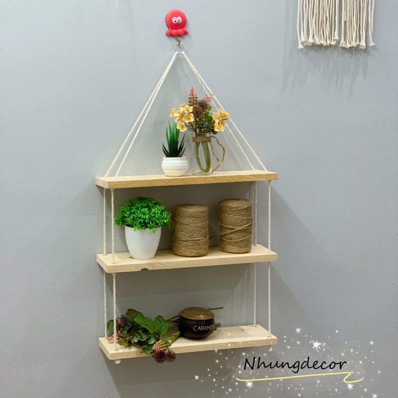 Sản phẩm gồm: kệ gỗ + dây thừng + khoen sắt (tặng kèm)