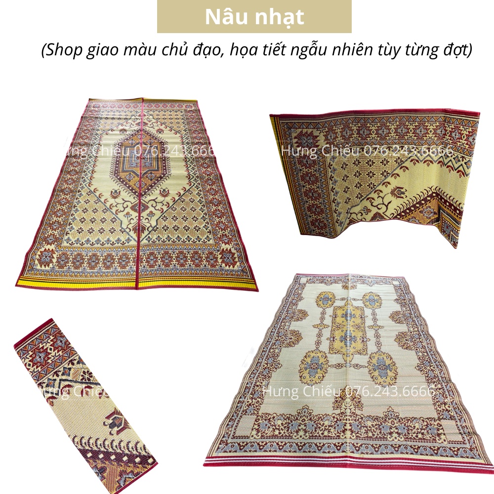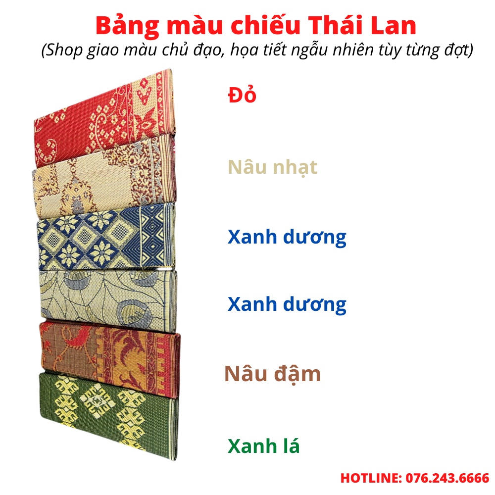 - Chiếu Thái Lan có rất nhiều hoa văn khác nhau như hình phượng hoàng, hình thổ cẩm. Kết hợp nhiều họa tiết như 1 tấm thảm rất đẹp và sang trọng khi bạn trải ngồi tiếp khách trong những buổi liên hoan. Hay các hoa văn Hươu Nai, hình thú ngộ nghĩnh khi trải ra cho bé ngồi chơi rất vệ sinh, mà không lo sàn nhà khi thời tiết lạnh hay nồm.