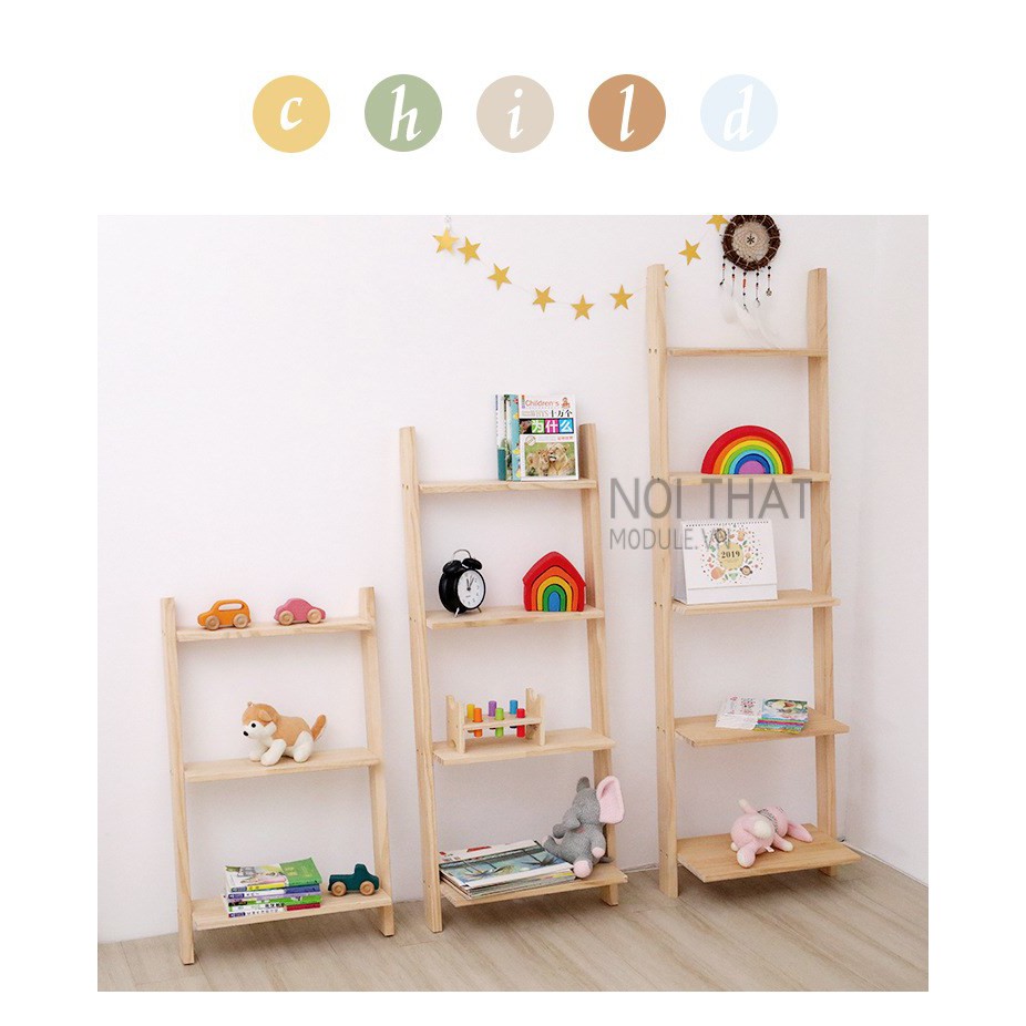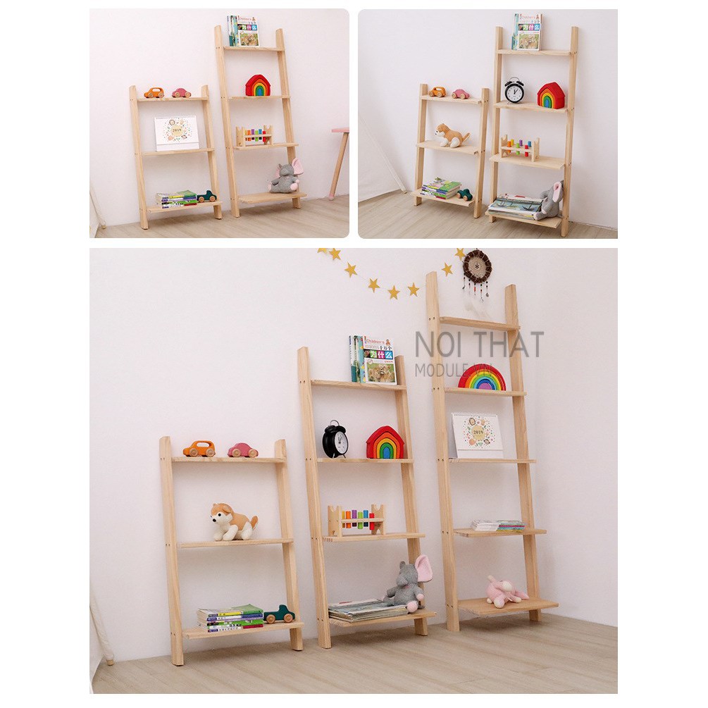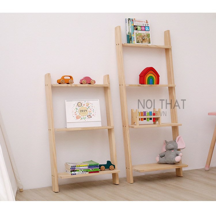 Kệ thang gỗ thông dựa tường 3 tầng dùng để các vật dụng trang trí sách báo, tạp trí và các vật dụng nhỏ khác.