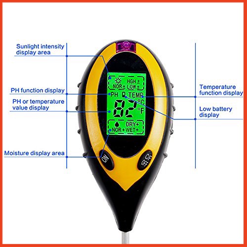 Máy đo độ PH đất 4 trong 1(PH, độ ẩm, ánh sáng, nhiệt độ) hay gọi là Dụng cụ đo PH 4 trong 1 đồng hồ hiển thị dạng điện tử, đo độ ẩm của đất, đo quang thông ánh sáng, đo nhiệt độ. (4 trong 1)Phần đo độ PH giá trị tương ứng là 3.5-9 trên đồng hồ hiển thị số, giá trị cơ bản của 7 là trung tính, nhỏ hơn số lượng lớn hơn các axit, theo cây trồng cần điều chỉnh độ pH của đất cho phù hợp.