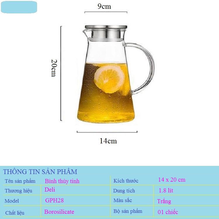 Giới thiệu Bình Đựng Nước Thủy Tinh Đẹp Chịu Nhiệt Cao Nắp Inox 304 Deli GPH28 Dung Tích 1,8 Lít