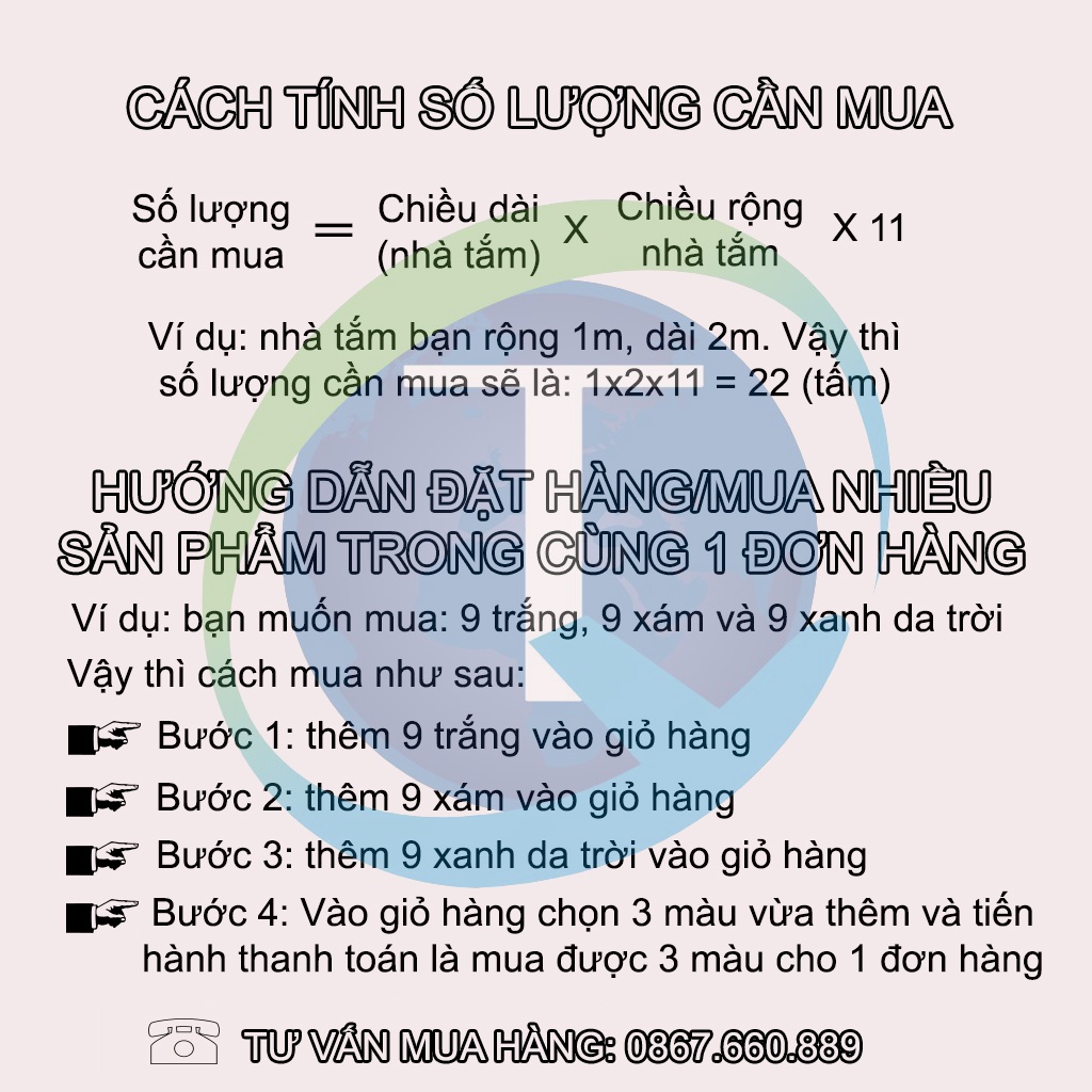 - CÔNG THỨC TÍNH SỐ TẤM CẦN MUA: DÀI X RỘNG X 11 TẤM = SỐ TẤM CẦN MUA