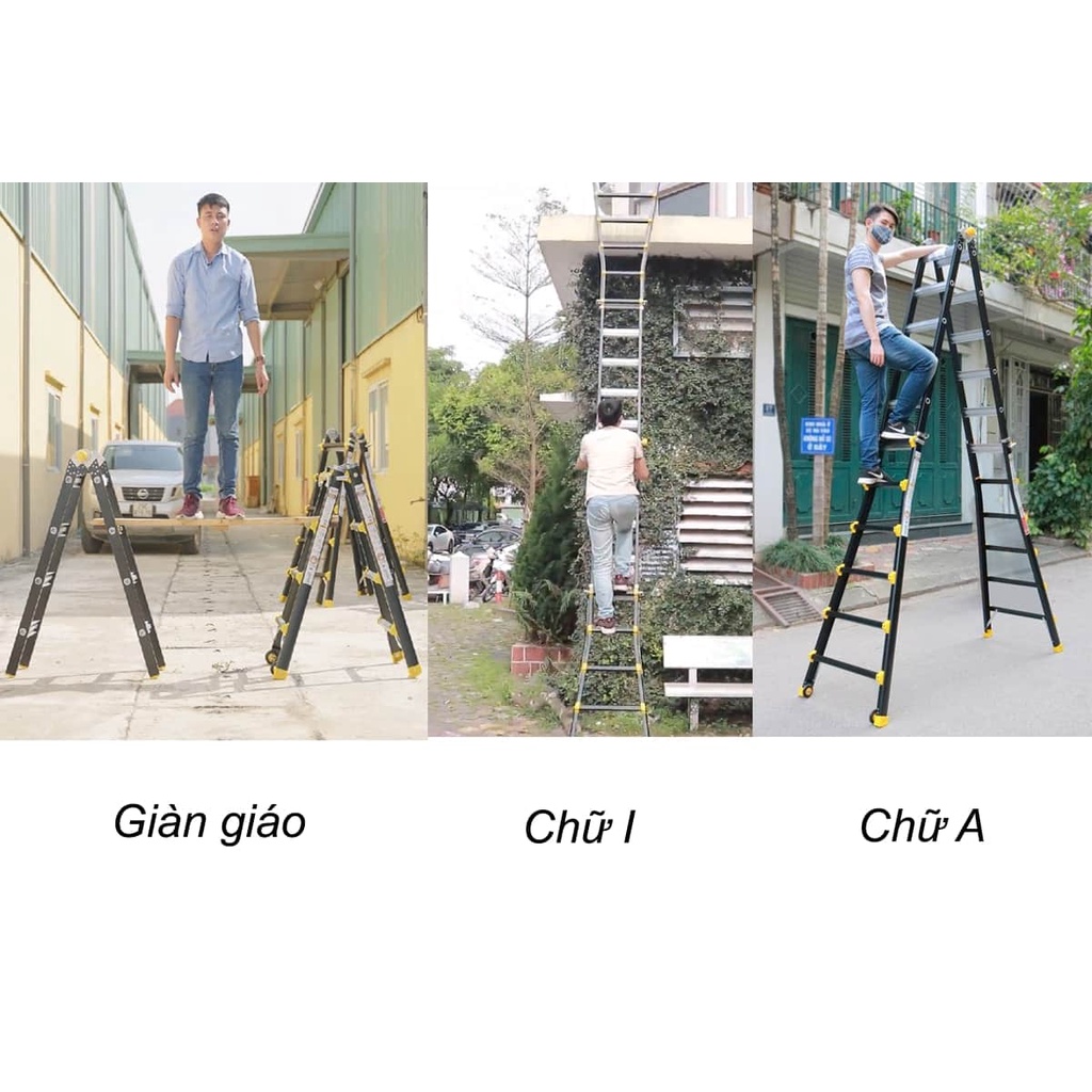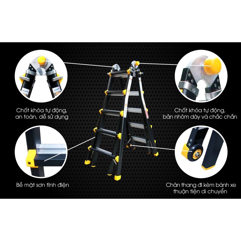 - Hệ thống chốt khóa tự động và chốt khóa bằng tay cực kì nhạy bén để bạn biến đổi cấu hình sử dụng chữ A, chữ I hay gấp gọn thang nhôm.