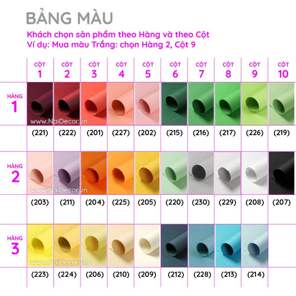 Ví dụ: Phông giấy màu trắng trong hình là Hàng 2, Cột 9 >> Khách chọn mua theo thuộc tính là Hàng 2 và chọn Cột 9