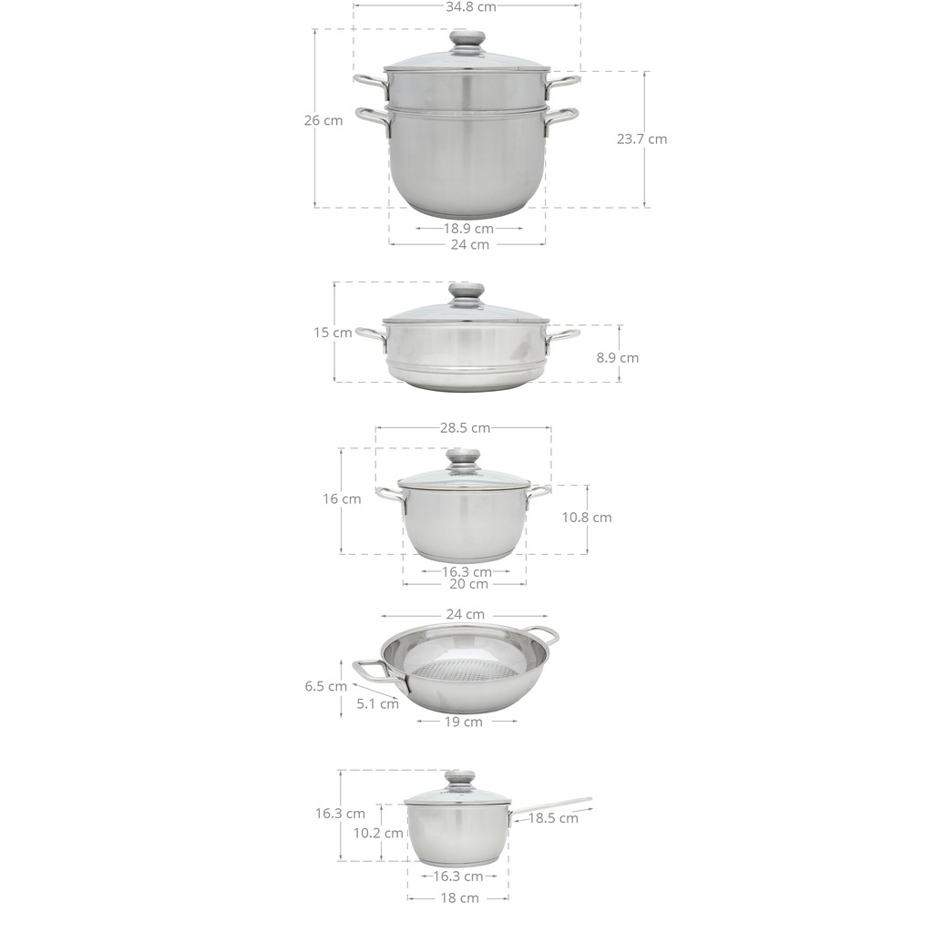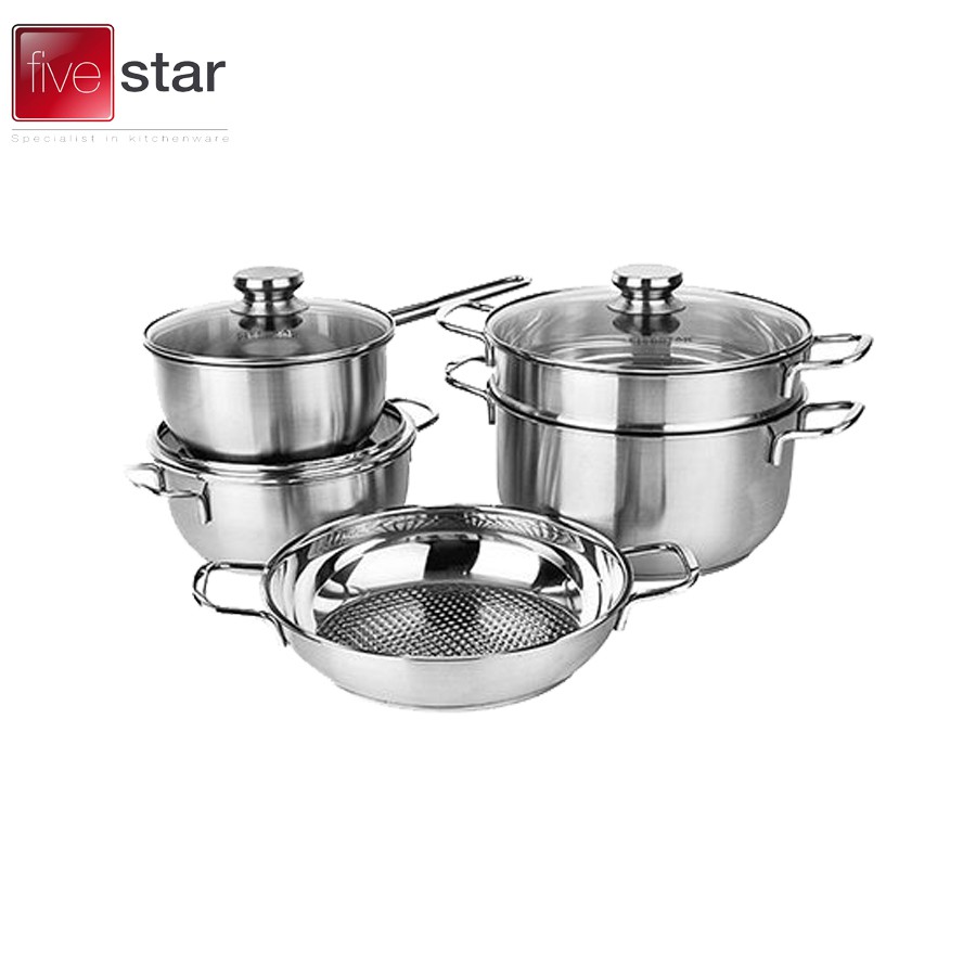 Bộ nồi 5 chiếc fivestar đường kính là 1 nồi: 24 x 14 cm; 1 nồi 20 x 10 cm và 1 nồi 18 x 10 cm; 1 chảo: 24 x 6.5 cm và 1 xửng 24 x 8 cm