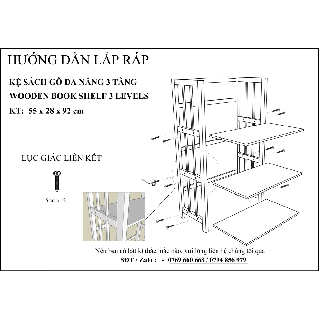 LƯU Ý: Kệ chưa lắp ráp sẵn, bộ sản phẩm đã bao gồm các thanh gỗ đã được khoan lỗ vị trí sẵn kèm bộ ốc vít đầy đủ để lắp ráp.