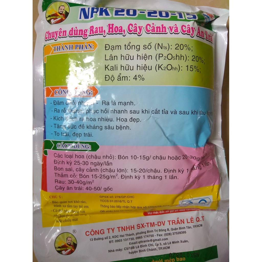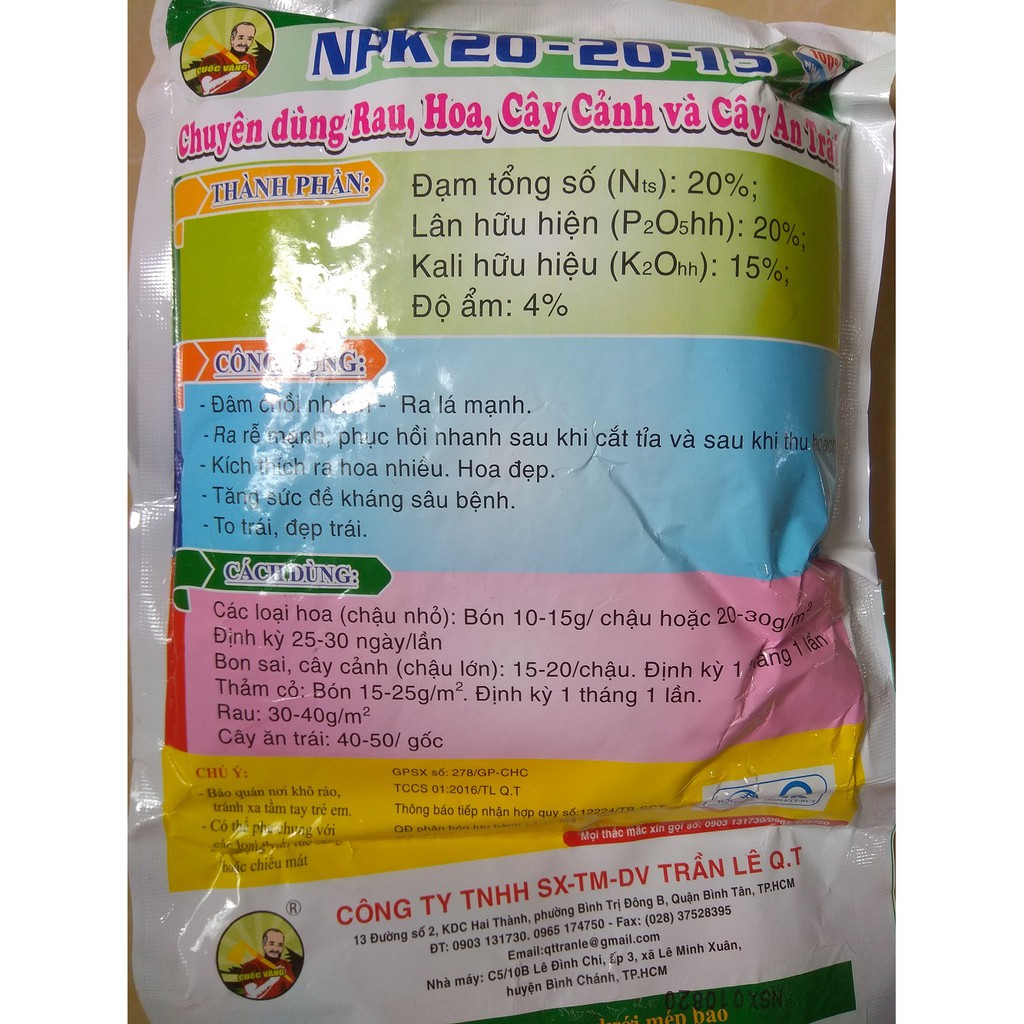 THÀNH PHẦN : Đạm (N): 20%, Lân (P2O5): 20%, Kali (K2O): 15%, Độ ẩm : 4%