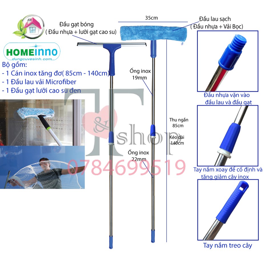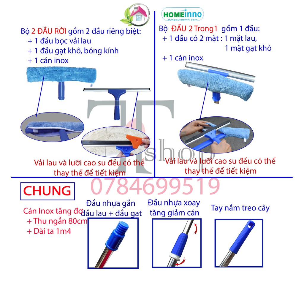 Giới thiệu Bộ Cây Lau Kính, Gạt Chùi Kiếng Homeinno Cán Dài 1m4 (2 Đầu Rời/Đầu 2 Trong 1)