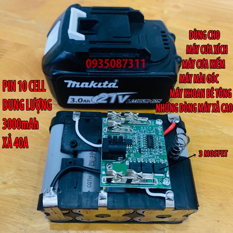 * 3000mah xả 40A: PIN 10 CELL 3000mAh xả 40A dùng cho các dụng cụ cầm tay như máy mài góc,máy cưa xích,máy cưa kiếm,máy khoan bê tông... chân pin MAKlTA 40mm NHỮNG DÒNG MÁY XẢ CAO Máy có than và không than 21V .