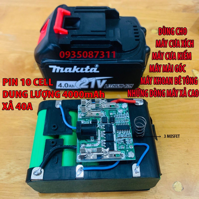 * 4000mah xả 40A: PIN 10 CELL 4000 mAh xả 40A dùng cho các dụng cụ cầm tay như máy mài góc,máy cưa xích,máy cưa kiếm,máy khoan bê tông... chân pin MAKlTA 40mm NHỮNG DÒNG MÁY XẢ CAO Máy có than và không than 21V