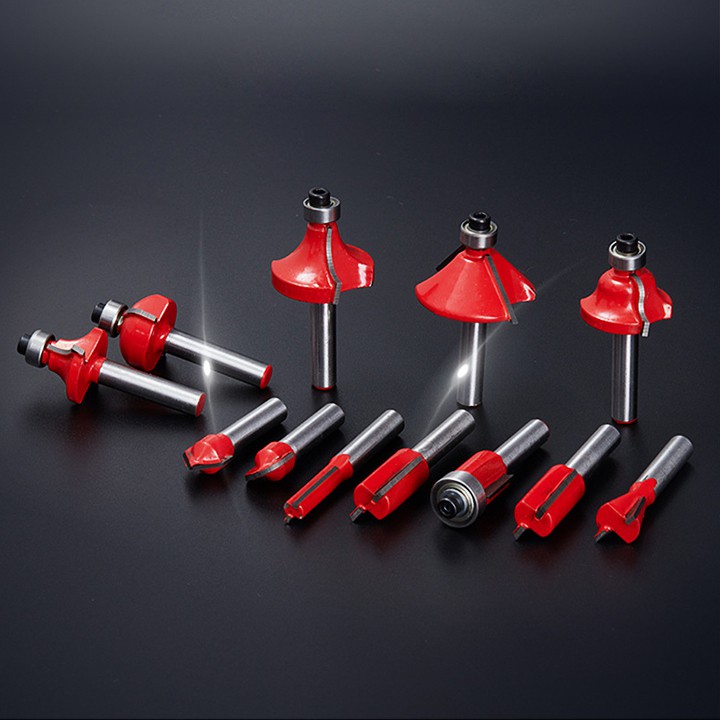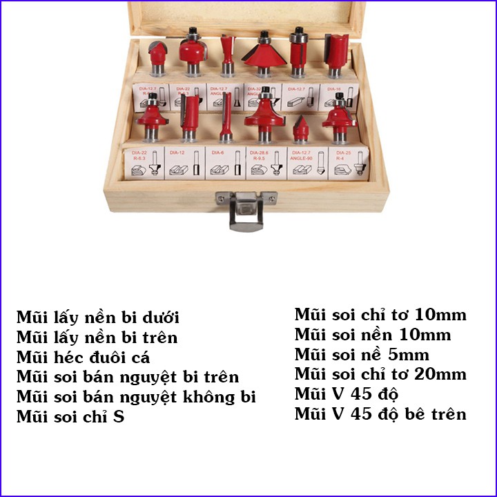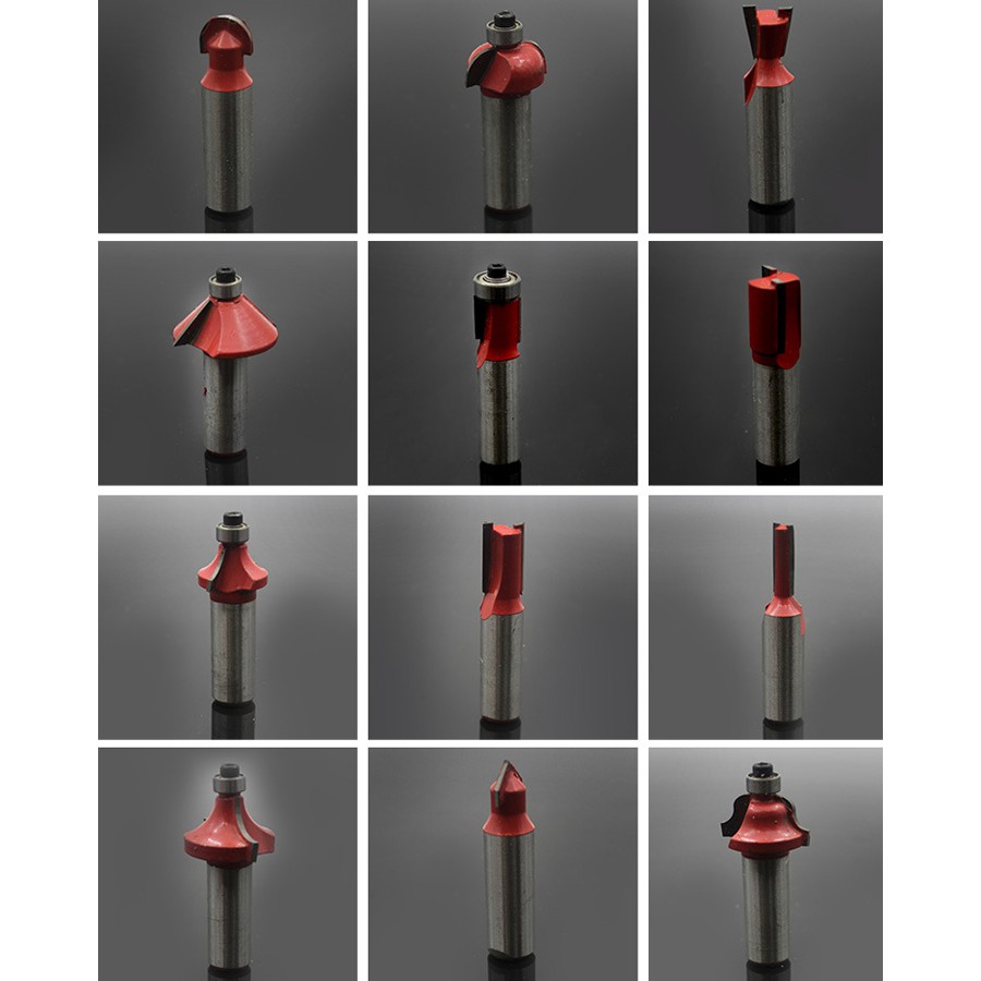 - Bộ mũi phay gỗ 12 món chuyên dùng cho máy phay cầm tay hoặc máy bàn router