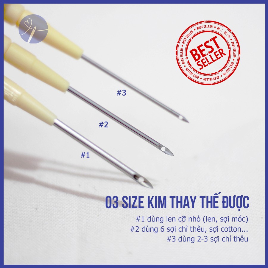 - Kim Thêu Nổi Punch Needle được thiết kế với 1 thân bút nhựa gồm 12 nấc điều chỉnh độ cao, 3 đầu kim 3 cỡ khác nhau: nhỏ/nhỡ/lớn để dùng với chỉ thêu hoặc len nhỏ (Len Vĩnh Thịnh, sợi cotton việt nam 1mm), thân kim có lò xo giúp bạn thêu êm tay hơn trong quá trình sử dụng, đi kèm là dây xỏ chỉ chắc chắn và giấy hướng dẫn sử dụng với hình vẽ minh họa rõ ràng