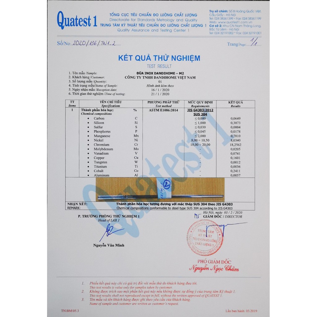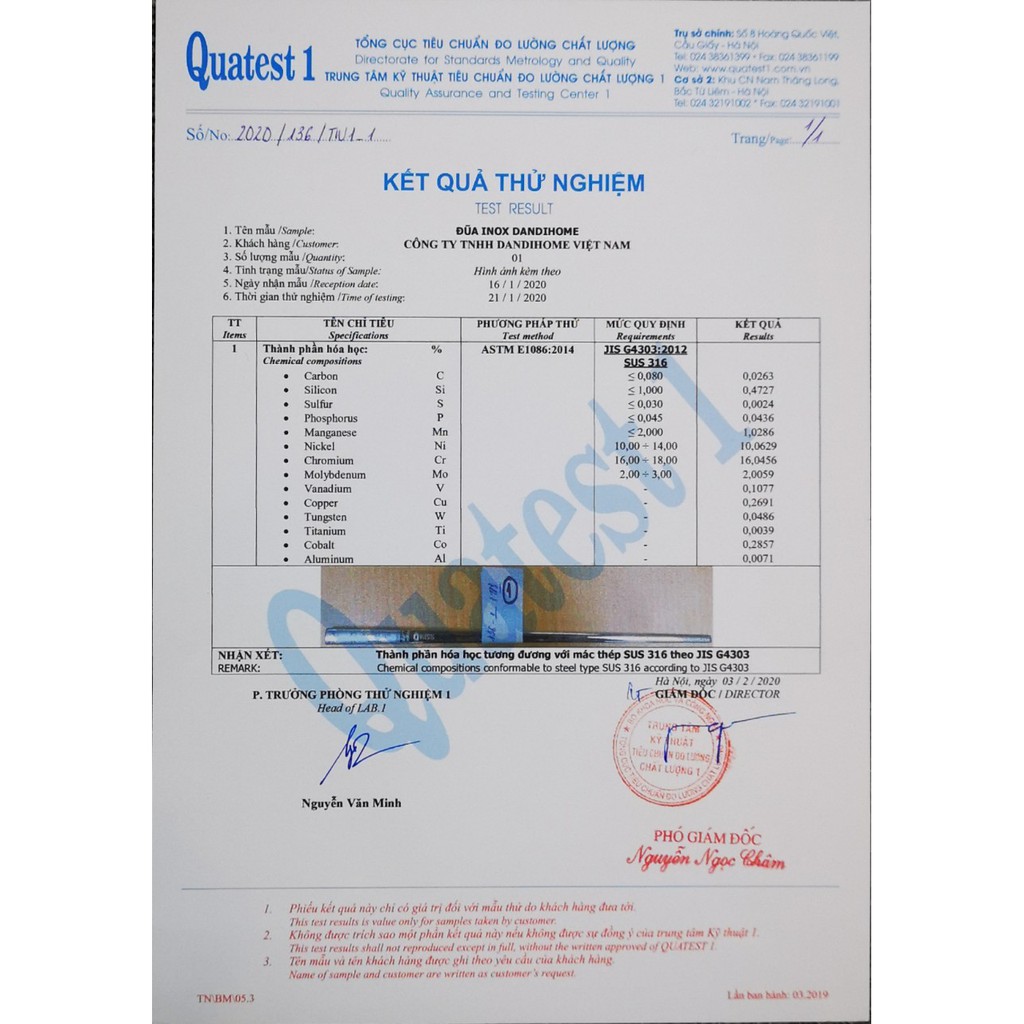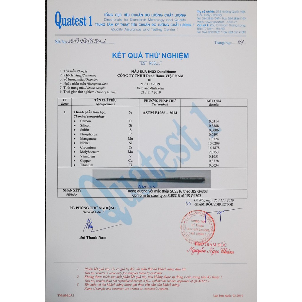 Đạt tiêu chuẩn An Toàn Vệ Sinh theo Quy chuẩn Kỹ thuật Quốc gia QCVN 12-3:11/BYT và mác thép SUS304 và SUS316 theo Tiêu Chuẩn Nhật Bản JIS G4303 (Các sản phẩm Inox được thí nghiệm tại Tổng cục tiêu chuẩn đo lường chất lượng – Số 8 Hoàng Quốc Việt – Cầu Giấy – Hà Nội)