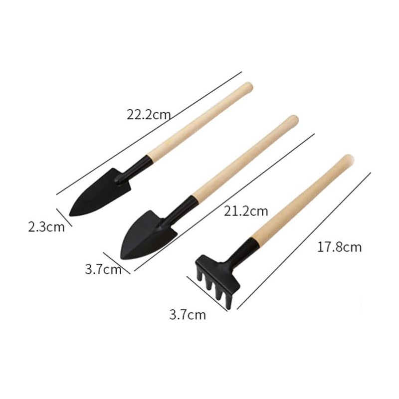 Bộ dụng cụ làm vườn mini 3 món bao gồm: 1 cây cào, 1 cây xẻng đầu tròn và 1 cây xẻng đầu nhọn.