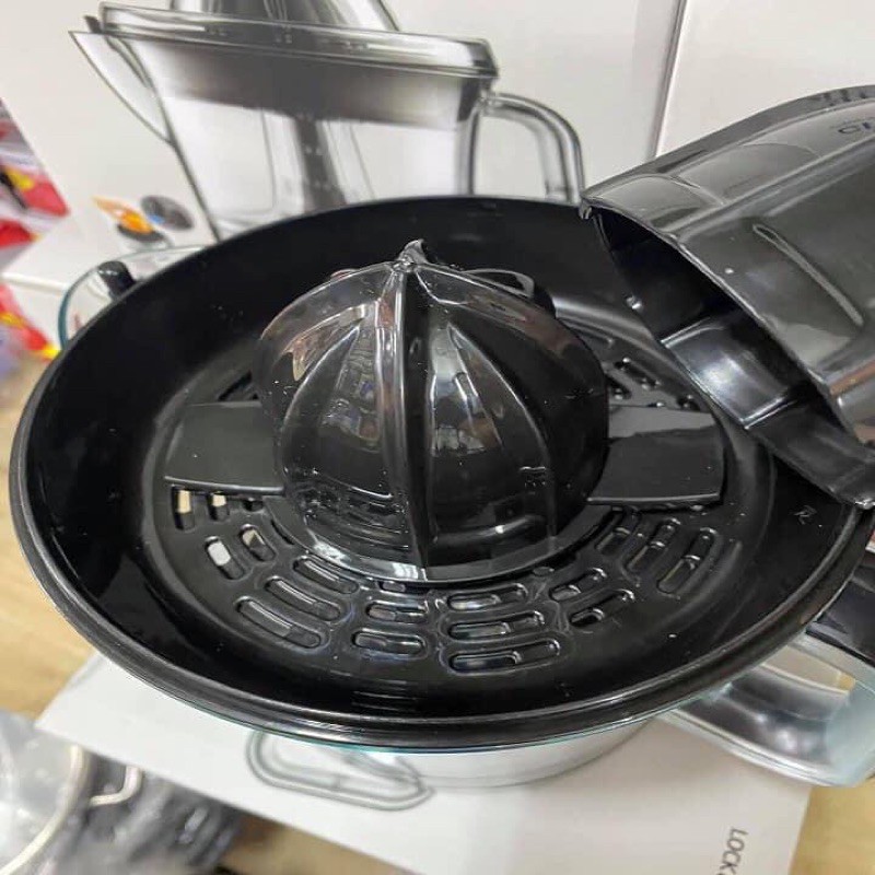 Đặc biệt, sản phẩm trang bị bình đựng trong suốt giúp bạn quan sát được lượng ép bên trong. Nắp đậy bảo vệ bên ngoài và nắp đậy đầu vắt bên trong giúp ngăn ngừa bụi bẩn, vi khuẩn xâm nhập hiệu quả. Quai cầm dày chắc kết hợp cùng miệng rót trên bình đựng.