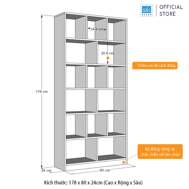 - Kệ kích thước cao 178cm, dài 80cm và rộng 24cm có 6+1 tầng hệ len chân chắc chắn, hệ pát chống lật giúp hạn chế tối đa nguy cơ đổ ngã.
