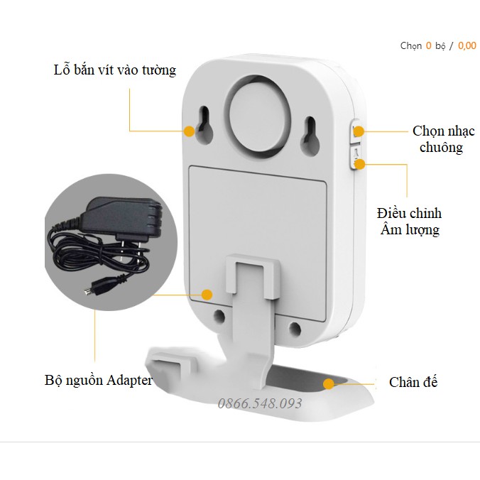 - Chuông hỗ trợ 36 kiểu âm thanh, 5 giọng chào hoặc chế độ báo động ở tần số 113dB