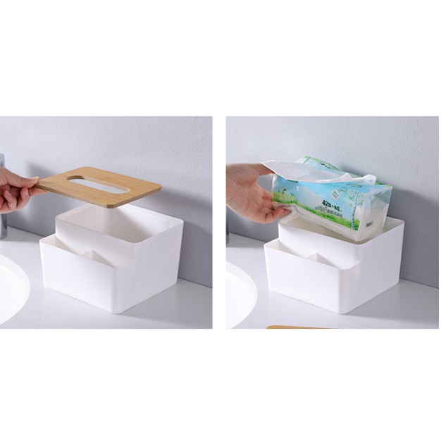 Hộp Đựng Giấy Vuông Để Bàn Ăn 2 Ngăn Đựng Đồ Thông Minh Nắp Gỗ Decor