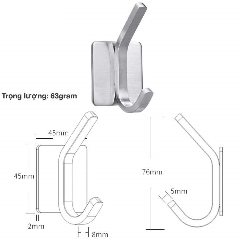 Móc Inox304 không khoan tường , keo dán 3M treo đồ dán vào tường , nhà tắm ...