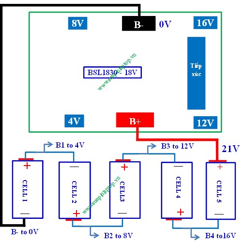 - Hàn theo thứ tự từ B- (0V, dây âm tải), 3.7V (B1), 7.4V (B2), 11.1V (B3), 14.8V (B4) và B+ (18V, dây dương tải).