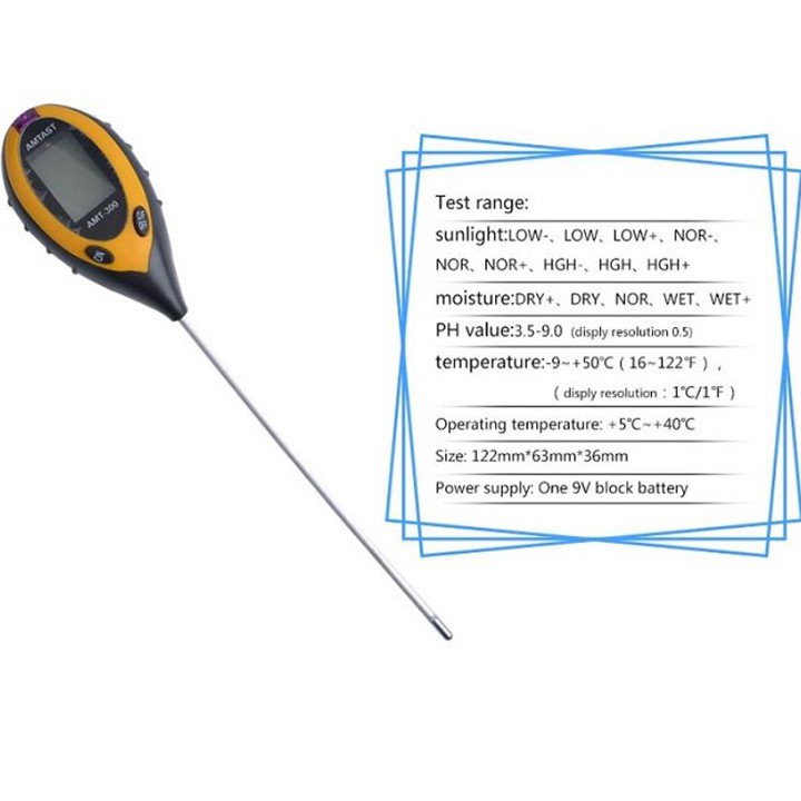 Đặc điểm:Máy phân tích đất màn hình điện tử 4 trong 1 là thiết bị đo độ đất mới nhất, chủ yếu để kiểm tra độ PH của đất, độ ẩm, nhiệt độ và cường độ ánh sáng của cây trồng, sử dụng pin Carbon 9V (không bao gồm). Dụng cụ này thông qua màn hình tinh thể lỏng đo thông số. Thiết bị cũng có chỉ báo nguồn điện thấp và chức năng tự động tắt nguồn. Sản phẩm giúp tiết kiệm thời gian và năng lượng, hiệu quả cao. Dụng cụ này thích hợp trồng hoa cỏ, phủ xanh sân vườn.