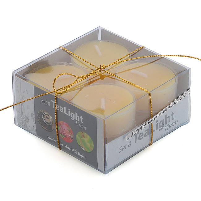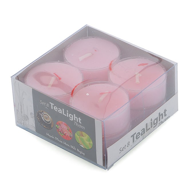 Hộp sản phẩm bao gồm 8 nến tealight thơm đế nhựa.Kích thước mỗi nến (D x C cm): 3.8 x 1.5. Trọng lượng: 20 g/ nến. Thời gian cháy: 4 giờ.